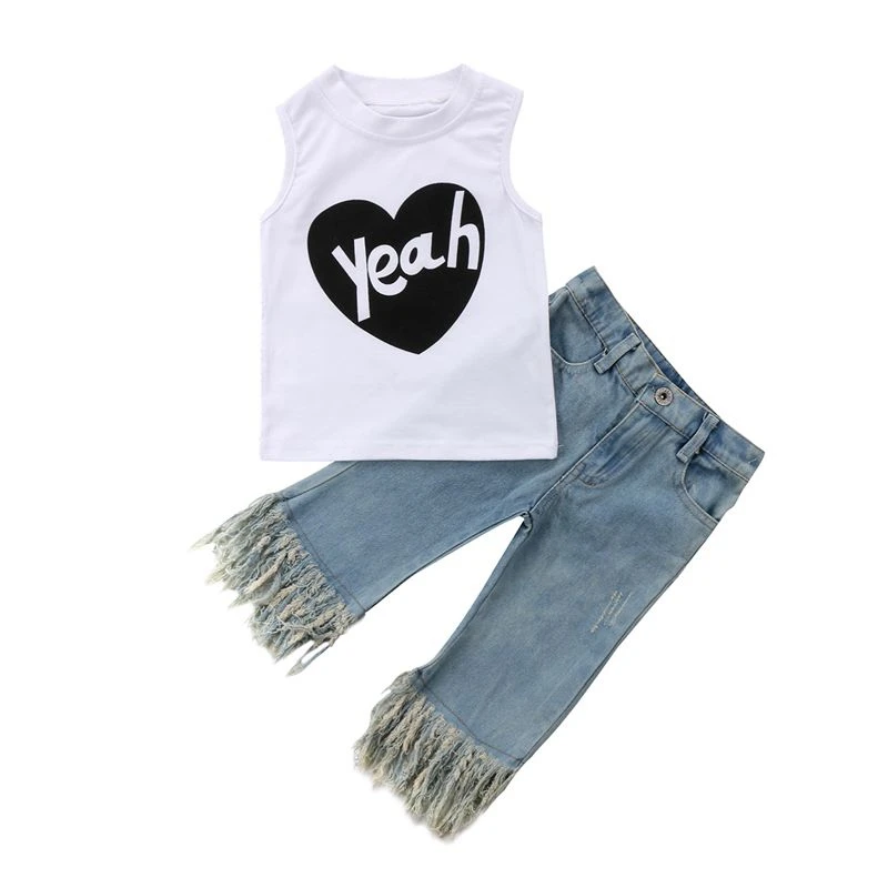 Best Price of Baby Kids Girls Sleeveless T-shirt Vest Top + Tassel Jeans Denim Pants Outfits Set Clothes