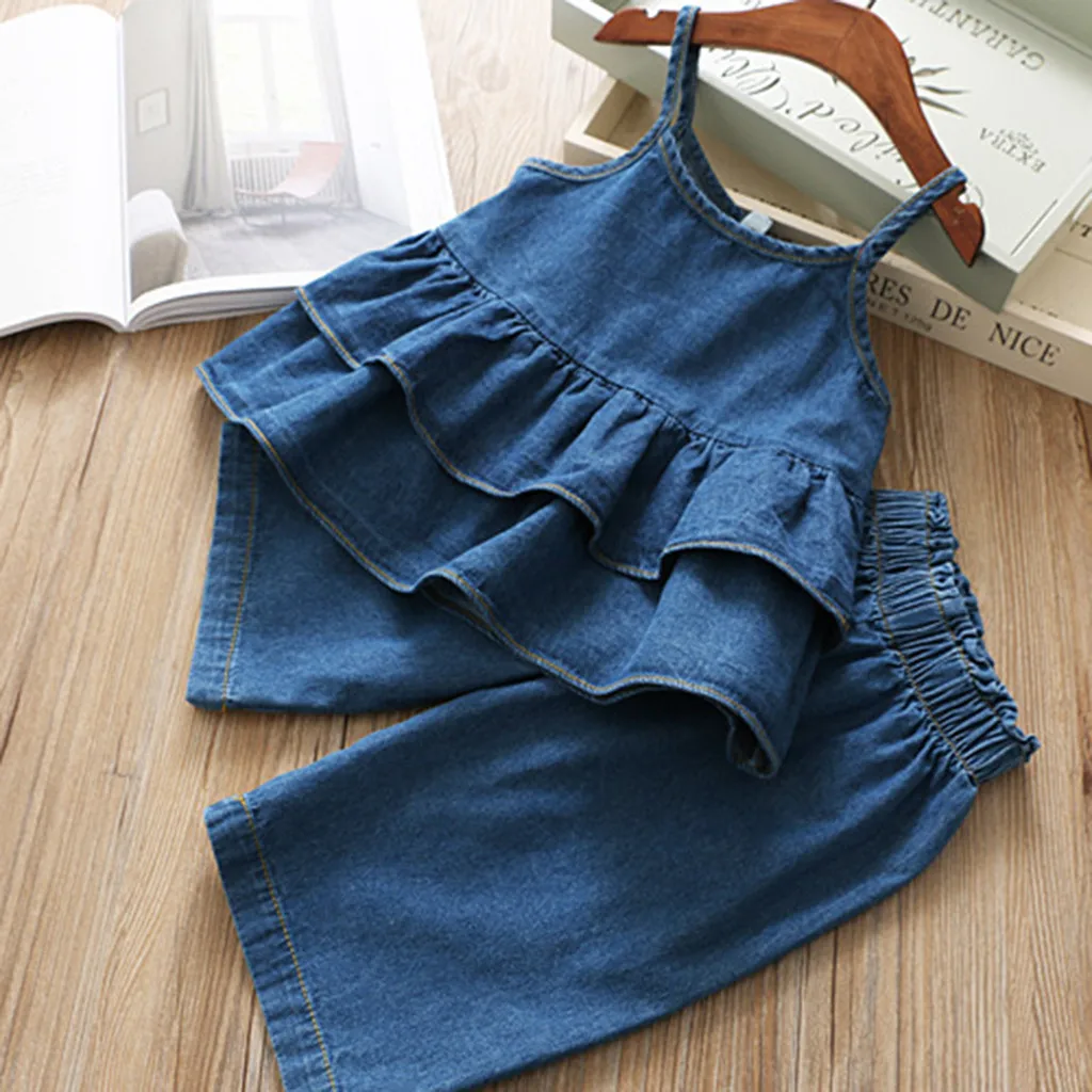 Good Offer of Kids clothes baby Fashion Denim Strap Ruffles Tops Solid Jeans Casual Outfits Set children's clothi